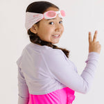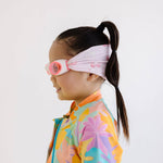 Our Cherry Charms swim goggle features our tangle-free strap in a cherry and bow print on a light pink background, paired with a white frame and lightly tinted pink lenses.