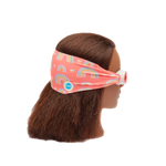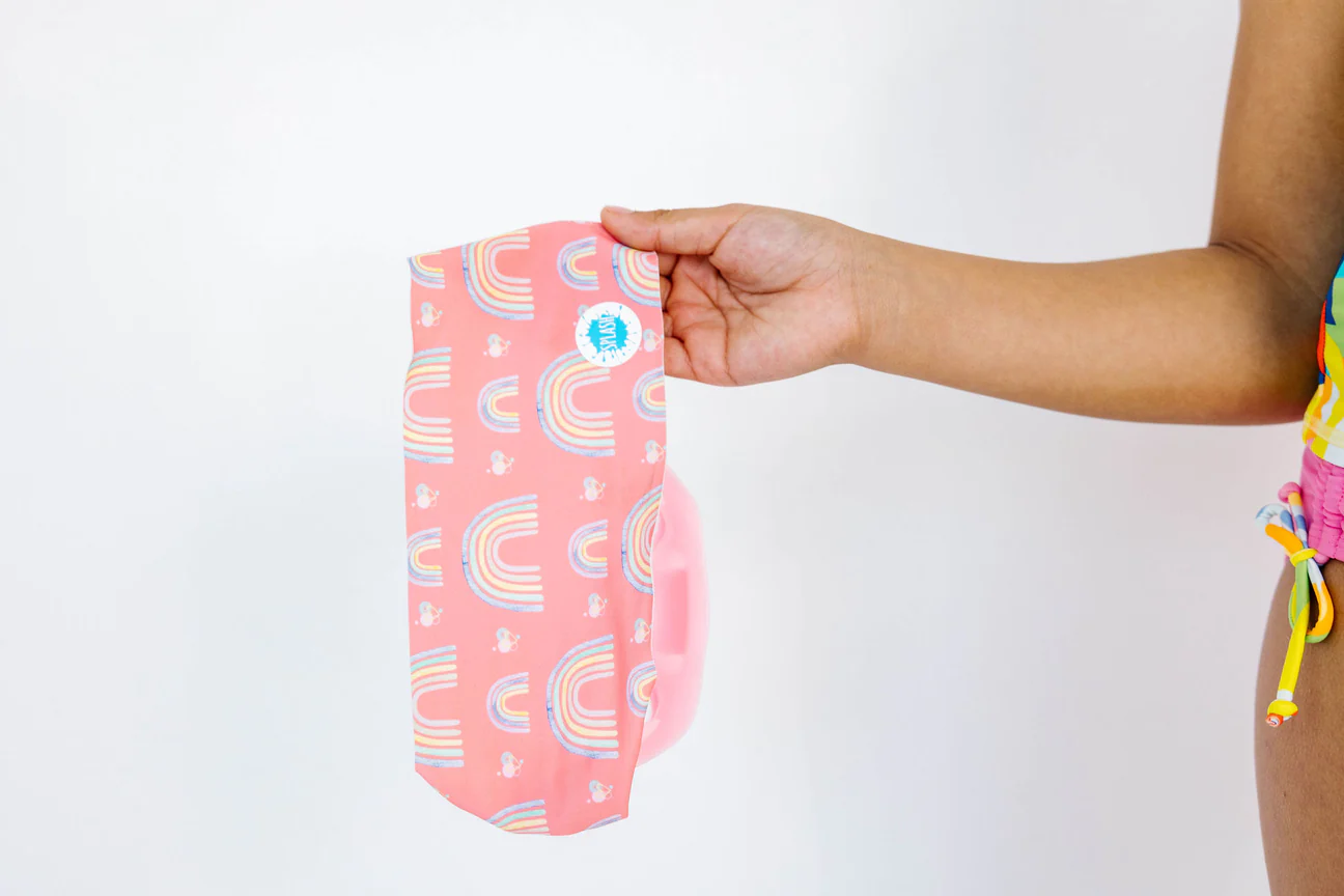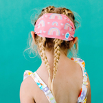 Our Over the Rainbow swim goggle features our tangle-free strap in a pretty pastel rainbow print on a pink background, paired with a white frame and lightly tinted pink lenses.